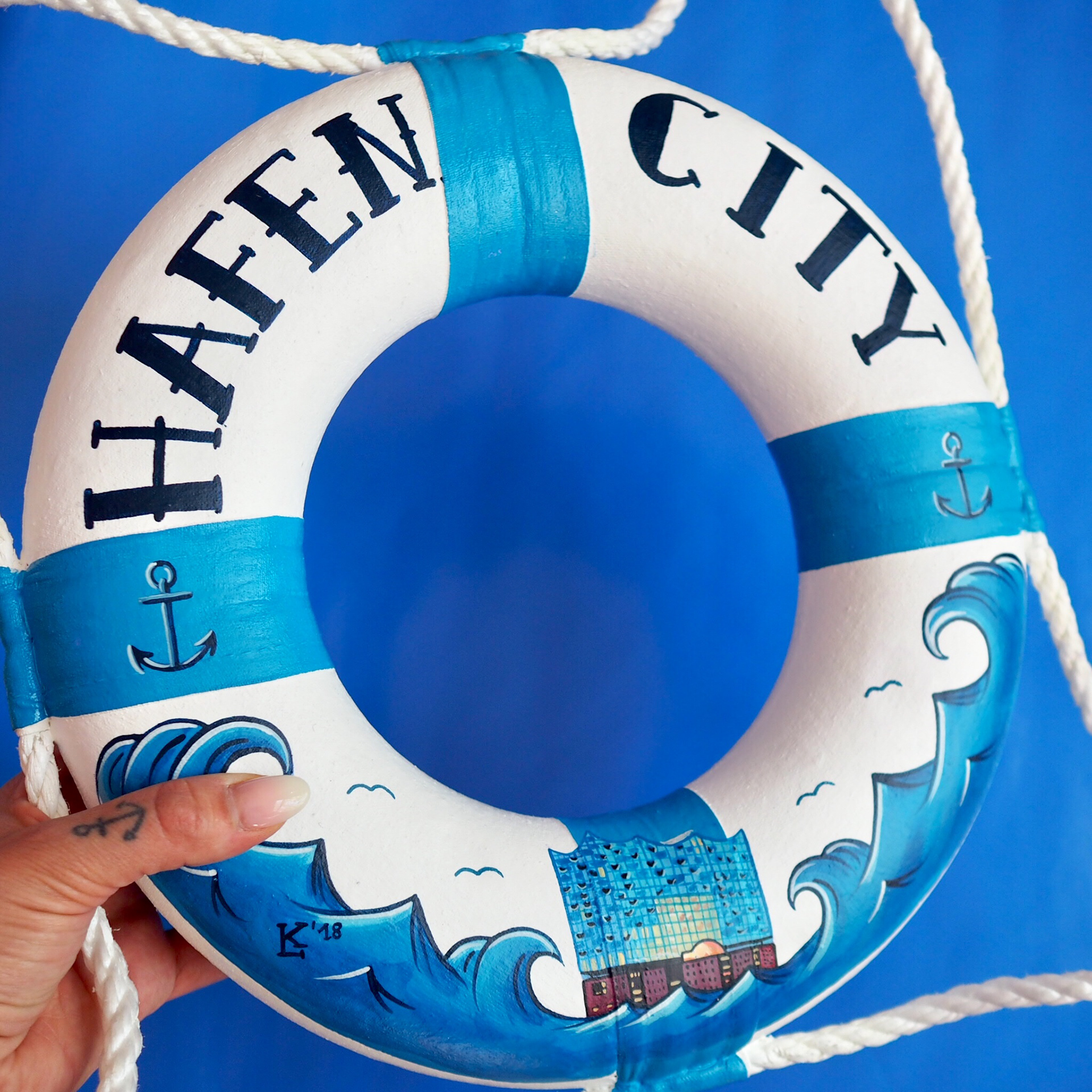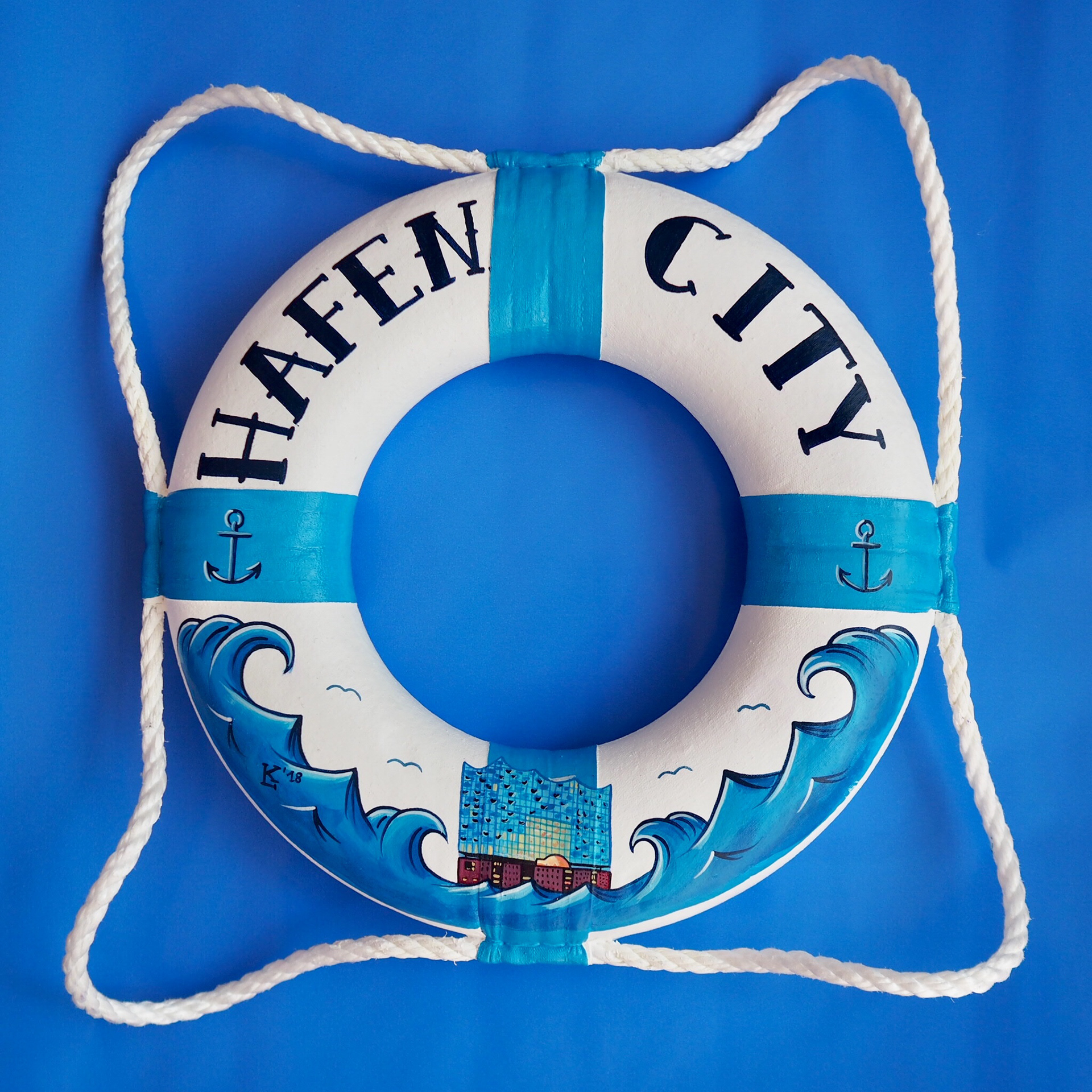 2018 | Jeder Ring ein Original und ein absolutes Unikat! Dieser kleine Ring ist ein echter handgemachter Rettungsring, 30cm im Durchmesser und made in Hamburg! Mehr Infos...